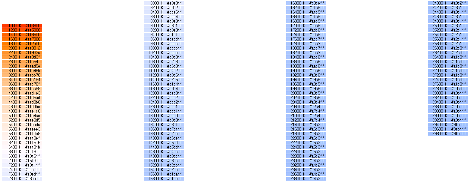 1000 K #ff3800 1200 K #ff5300 1400 K #ff6500 1600 K #ff7300 1800 K #ff7e00 2000 K #ff8912 2200 K #ff932c 2400 K #ff9d3f 2600 K #ffa54f 2800 K #ffad5e 3000 K #ffb46b 3200 K #ffbb78 3400 K #ffc184 3600 K #ffc78f 3800 K #ffcc99 4000 K #ffd1a3 4200 K #ffd5ad 4