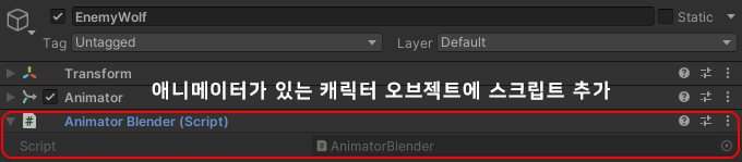 - 코루틴을 사용하여 블렌드를 하기 위해 AnimatorBlender.cs를 캐릭터 오브젝트에 추가합니다.