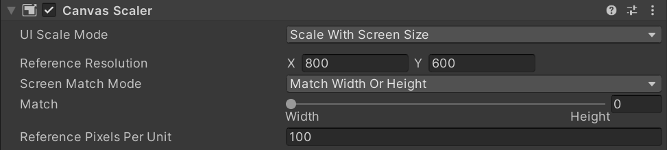 - 해당 프리팹은 캔버스이며, 캔버스 스케일러 설정은 다음과 같습니다.