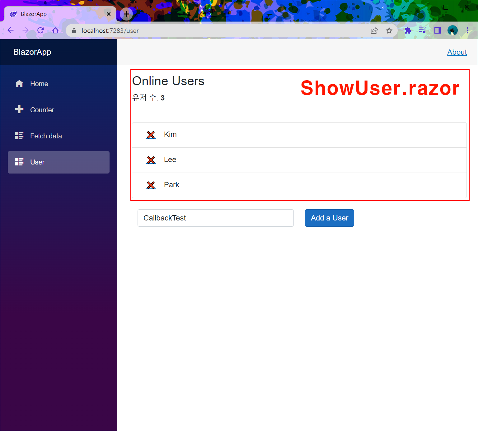 - 빨간 사각형 영역의 내용은 ShowUser.razor 컴포넌트 구성요소에 의해 생성되었습니다.