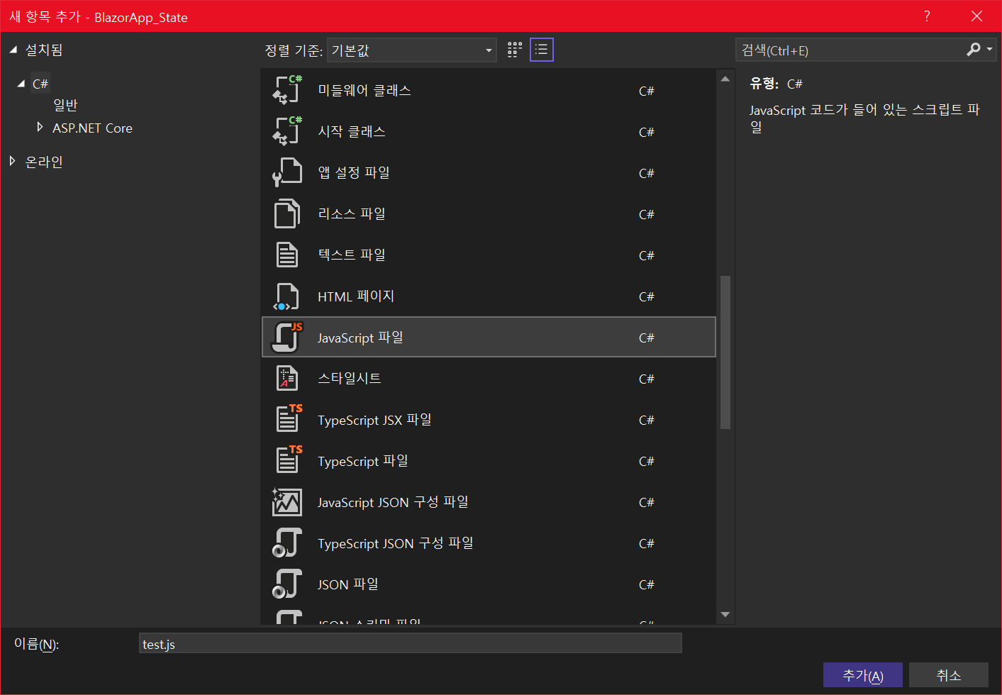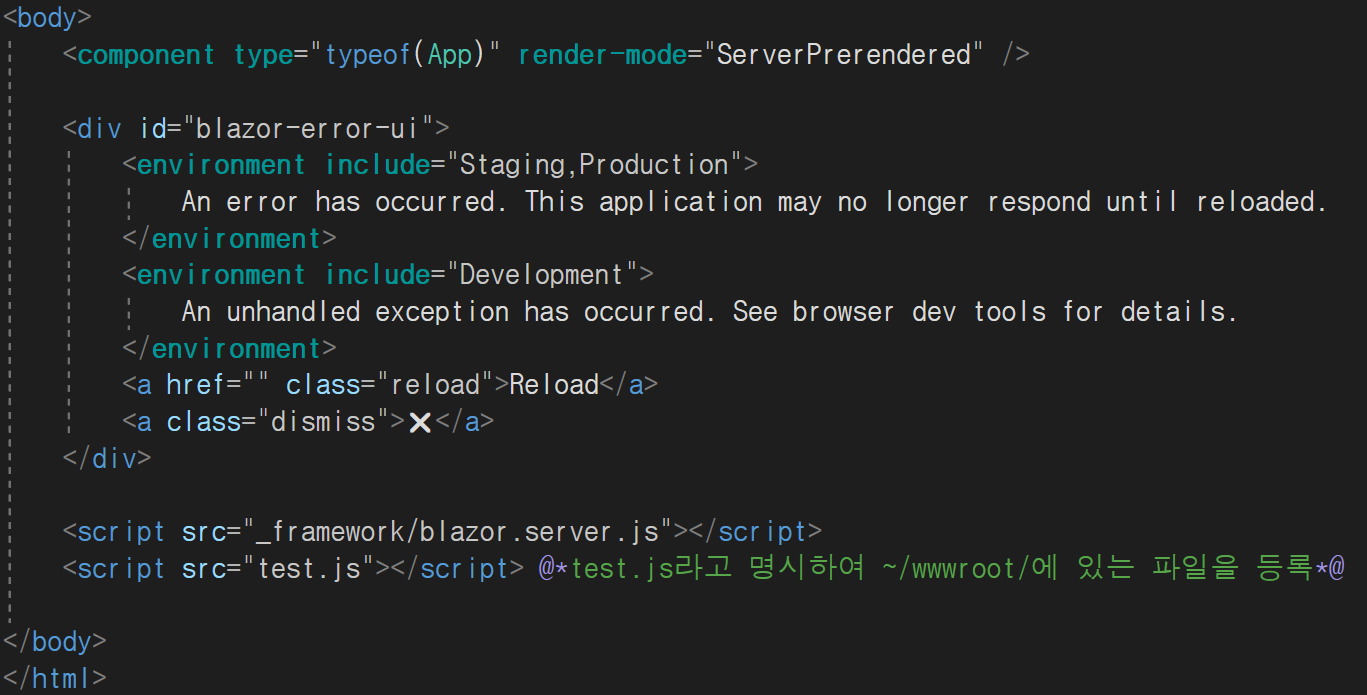 - Pages/_Host.cshtml에서 <script src="test.js"></script>라고 설정하여 test.js 파일을 등록합니다.