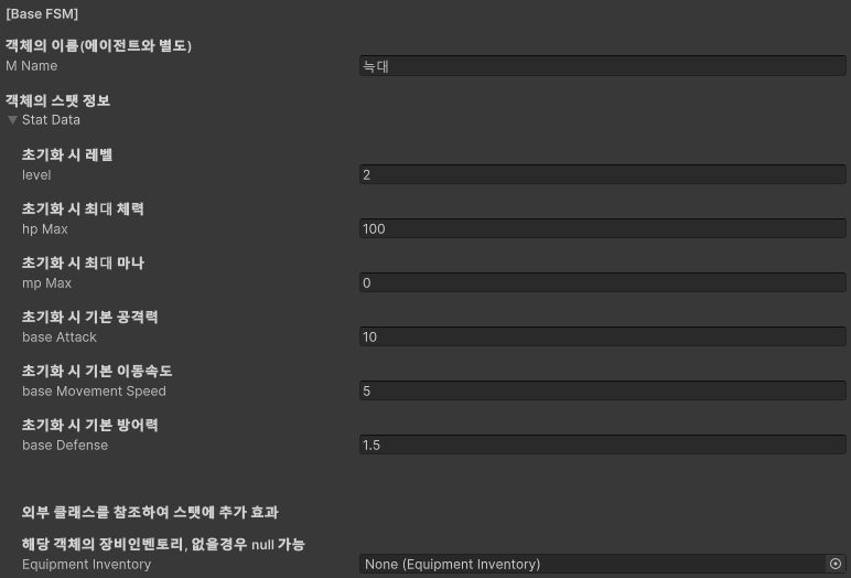 - 위 사진과 같이 '늑대'는 StatData를 가지고, 이곳에서 BaseStat을 초기화할 수 있게 됩니다.