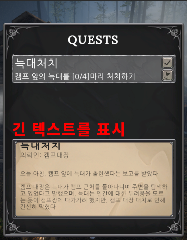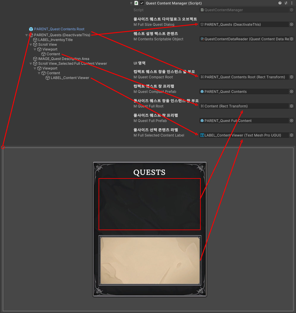 - 이번 글에서는 플레이어가 퀘스트를 이용할 때 그 내용들을 텍스트로 보여주기 위한 콘텐츠를 관리하는 기능을 다룹니다.
