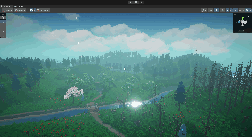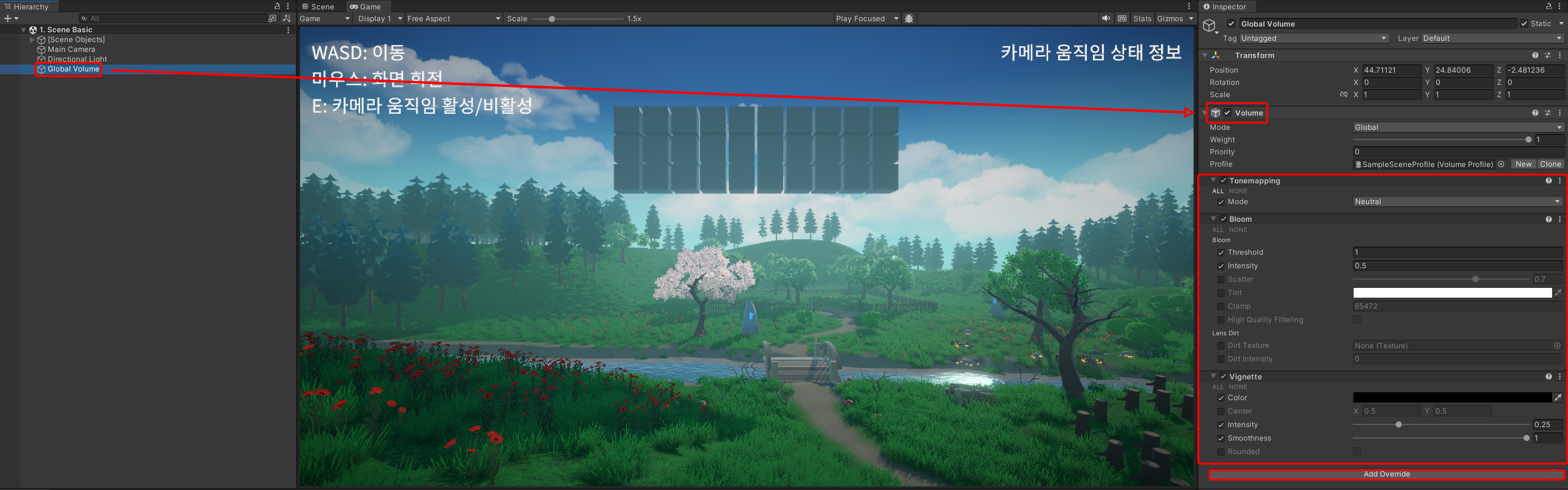 - 우측에 나타난 "Tonemapping", "Bloom", "Vignette"가 현재 적용된 필터 효과입니다.