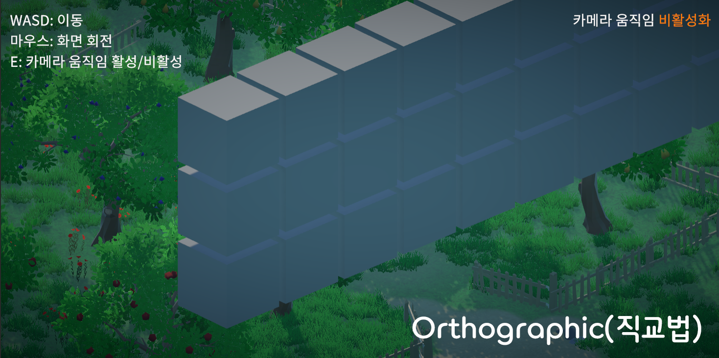 Orthographic(직교법): 이 투영 방식은 모든 객체를 동일한 크기로 표현하는 데 사용됩니다. Orthographic 투영은 원근감 없이 모든 객체를 균등하게 표시합니다. 이 방식은 2D 게임이나 일부 특수한 3D 스타일에 적합합니다.