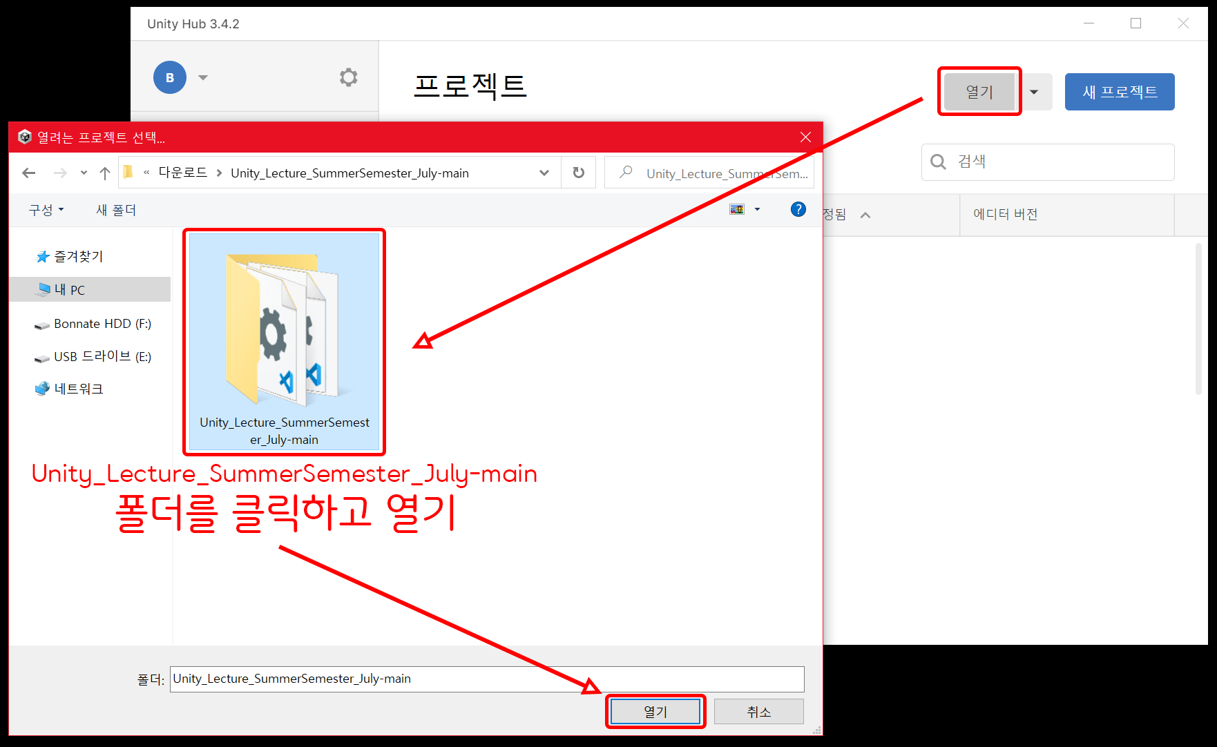 - 유니티 허브를 열고 열기 버튼을 누릅니다.