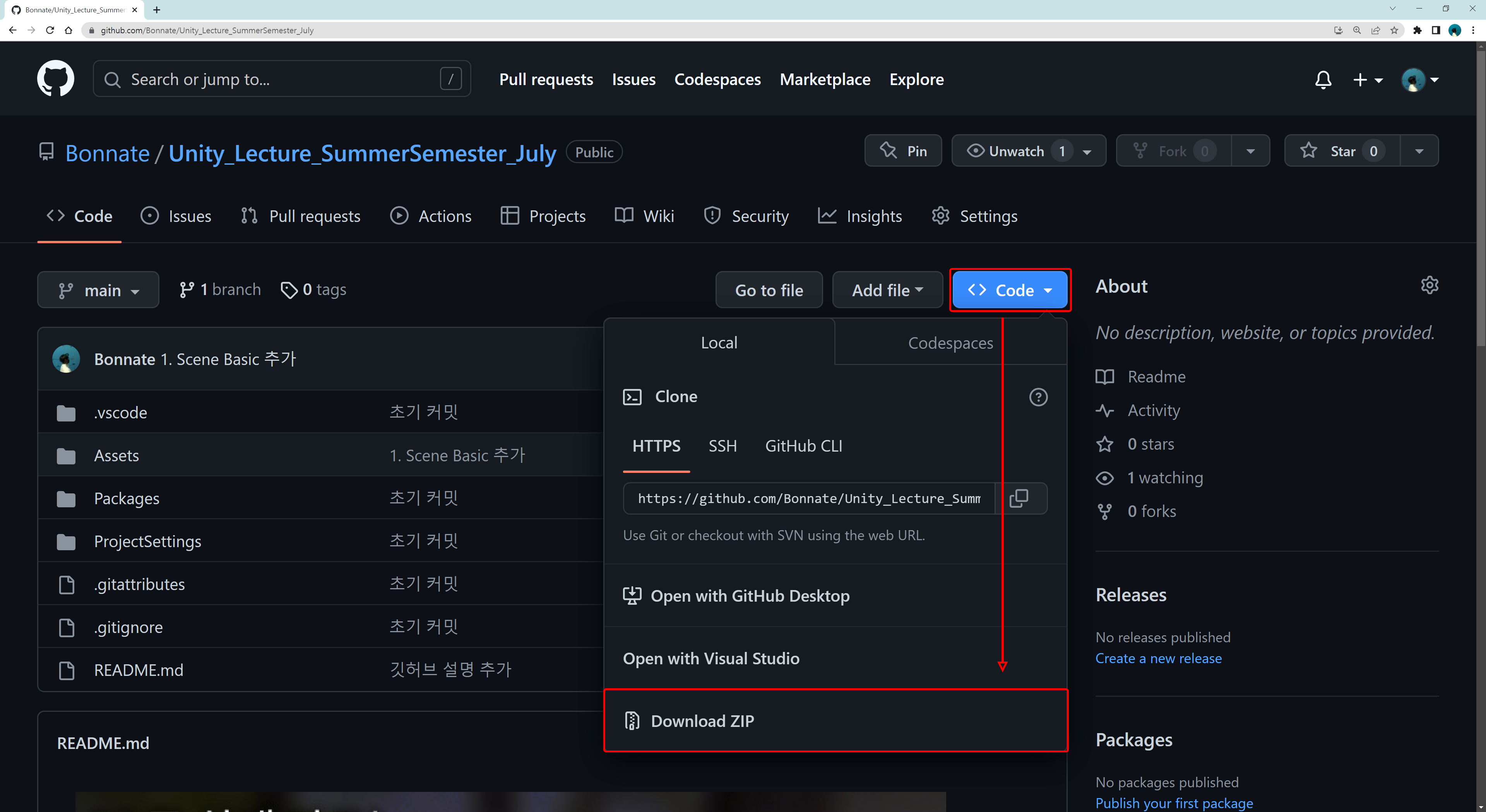 - 깃허브에서 유니티 프로젝트를 다운로드하고 여는 과정을 다룹니다.