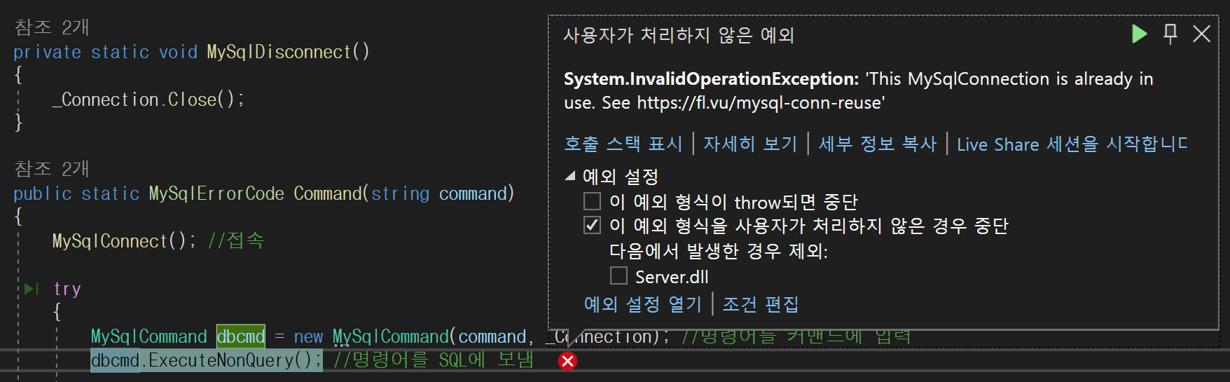 - This MySqlConnection is already in use. 오류가 나오며 현재 이 Connection이 사용중이라고 나옵니다.