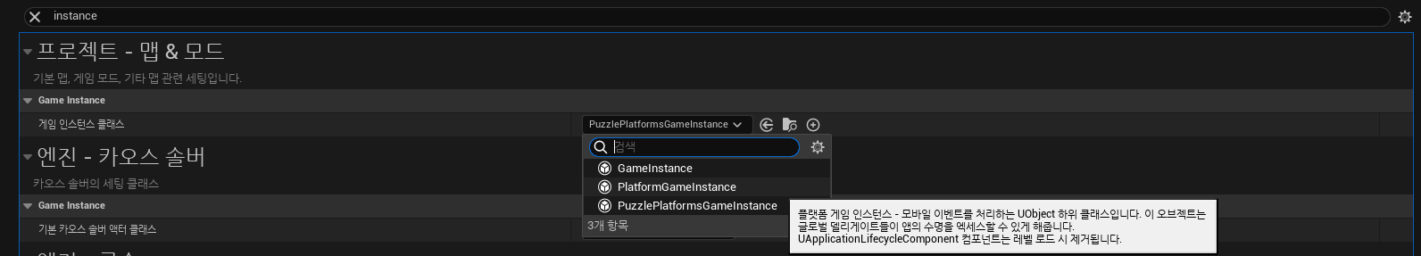 게임 인스턴스를 프로젝트 세팅에서 생성한것으로 교체한다.